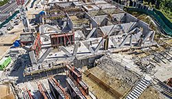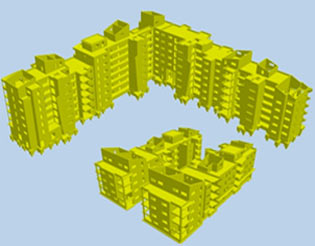 Il s'agit de bâtiments R+4 à R+7 en béton armé, fondés sur pieux et radiers, dimensionnés selon les règles EUROCODES. Ils présentent de très fortes irrégularités tant en plan qu'en élévation (formes géométriques, descentes de charges indirectes au niveau du RdC, répartition des rigidités).