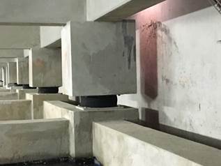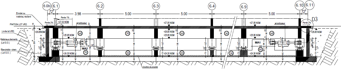 Conformément au cahier des charges sismique imposé par maître d’ouvrage les 5 bâtiments d’’enseignement sont disposés sur isolateurs. Le dispositif d’isolateurs et d’amortisseurs est situé en infrastructure enterrée. Il repose sur des fondations en semelles filantes reliées par un réseau bidirectionnel de longrines.