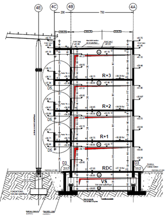 R+2 et R+3 sont contreventés en superstructures par les façades ajourées dans