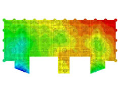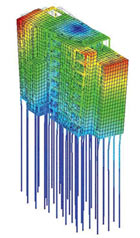 Dans le cas des radiers, l’interaction sols-structures a été introduite dans les modèles de façon à tenir compte de son incidence sur le comportement dynamique global. Cette incidence peut être favorable ou non, selon la position de la période propre des superstructures seules sur le spectre de réponse, et il importe d’en tenir compte. Les raideurs de sol ont été introduites de façon à tenir compte des rigidités différentes au voisinage des inclusions rigides et dans les vides entre celles-ci. Le maillage des inclusions est pour des raisons d’exécution très régulier, et de ce fait ne correspond pas nécessairement aux descentes de charges de la structure. Plusieurs simulations ont été réalisées en vue de déterminer un optimum économique global entre différents maillages d’inclusions et différentes épaisseurs de radier. Outre le dimensionnement du complexe sol-fondations, l’objet des modélisations était également de justifier les tassements et déformations différentielles en tout point du radier, ainsi que les contraintes au sol.