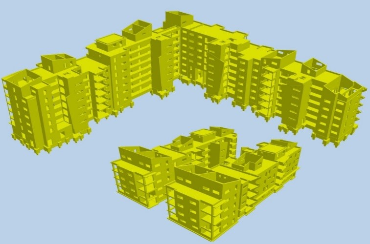 Il s’agit de bâtiments R+4 à R+7 en béton armé, fondés sur pieux et radiers, dimensionnés selon les règles EUROCODES. Ils présentent de très fortes irrégularités tant en plan qu’en élévation (formes géométriques, descentes de charges indirectes au niveau du RdC, répartition des rigidités). L’ensemble est constitué de 7 blocs différents.